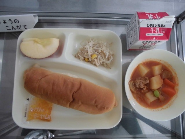 今日の献立は「コッペパン、みかんジャム、ケチャップ煮、ささ身と野菜のソテー、りんご」です。