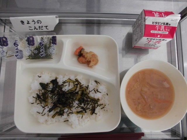 今日の献立は、学校給食献立コンクールで優秀賞を受賞した「こまつなっ葉めし、さけの和風マリネソースかけ、じゃがいもとベーコンのみそ汁」です。
