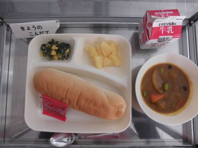 今日の献立は「コッペパン、いちごジャム、ミートボールと野菜のカレー煮、ツナとほうれん草のソテー、パインアップル(カット缶)」です。