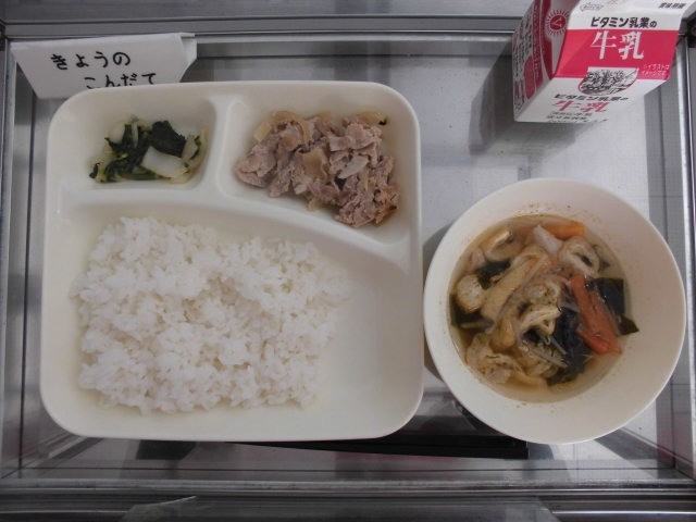 今日の献立は「ごはん、豚肉のスタミナ焼き、五目汁、菊菜と白菜のお浸し」です。