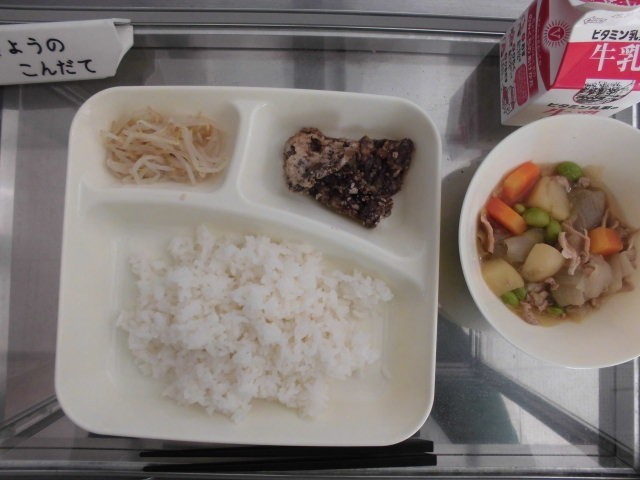 今日の献立は「ごはん、くじらの竜田揚げ、豚肉とじゃがいもの煮物、もやしの甘酢和え」です。