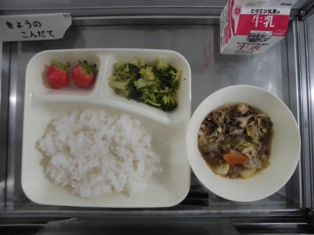 今日の献立は「ごはん、すき焼き煮、ブロッコリーのしょうが漬け、いちご」です。
