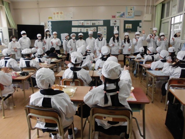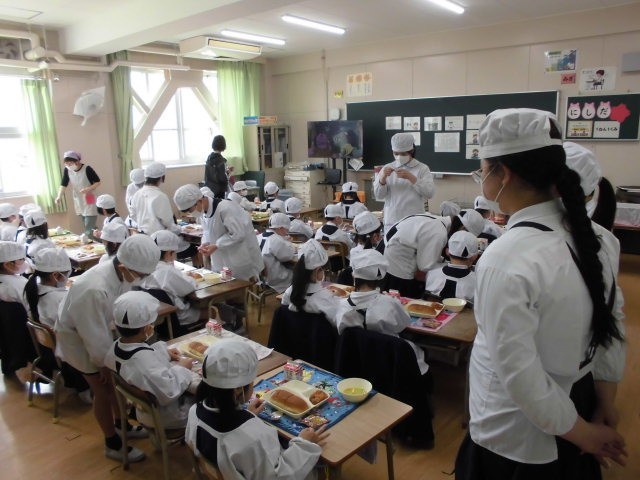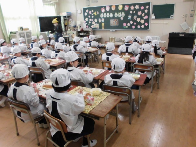 今日は、はじめて給食です。6年生のお兄さん、お姉さんが手伝ってくれて、準備はスムーズに進みました。6年生にお礼を言った後は、「いただきます。」のあいさつをして食べ始めます。感想を聞いてみると「おいしい!」「もっと食べたい!」「おかわりはあるんかなあ?」など、給食をおいしく食べてくれている子が多くて、ひと安心です。