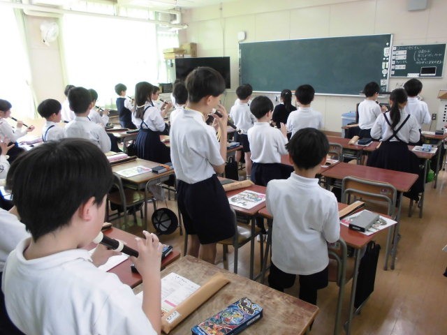 算数科では九九の表を使って「3×□=12」のような問題で□に当てはまる数をどのようにして求めるかを考えていました。音楽科では、初めて手にするリコーダーで音を出す練習をしていました。今日は、1つの音だけだったので「え、もう終わり?もっとやりたい。」といった声が聞かれました。どんどん練習して、いろいろな曲が吹けるようになってほしいです。