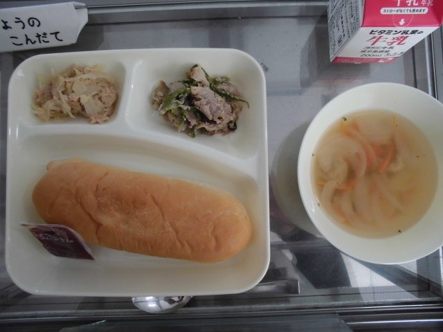 今日の献立は「コッペパン、豚肉のガーリック焼き、スープ、ツナとキャベツのソテー、いちごジャム」です。