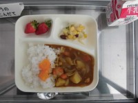 今日の献立は「チキンカレーライス、金時豆と野菜のサラダ、いちご」です。 6年生が...