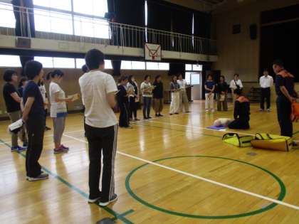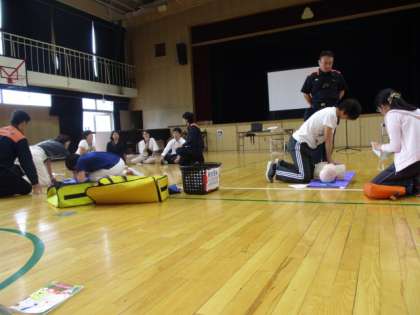 5月31日(金)、PTA保健給食委員会による「救命救急講習会」を行いました。人の命を救うためのカギとなる胸骨圧迫(心臓マッサージ)とAEDの使い方の実技をしました。