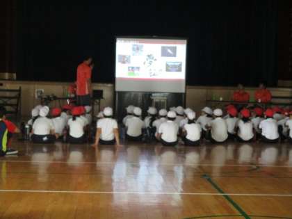 トップアスリート夢授業がありました。 公開日 2019/06/12 更新日 2019/06/12 学校日記 6月11日(火)の2・3校時トップアスリート夢授業としてラグビー選手を迎えて学習をしました。訪問いただいた選手は、「レッドハリケーンズ」の指田(さしだ)選手、佐藤(さとう)選手、久内(くない)選手、くらた選手でした。講堂でラグビーについてDVDで学習後、運動場でパス等のゲームをしました。 いいね(0)