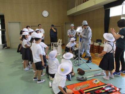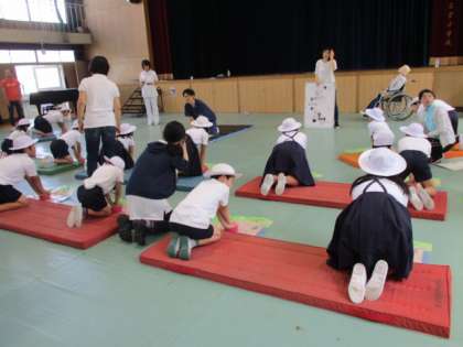 避難訓練後の、応急処置、胸骨圧迫、防災備品を使っての説明や実技の様子です。