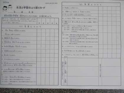 「ふり返りカード」の点検をお願いします。 公開日 2019/06/28 更新日 2019/06/28 学校日記 この日の全校朝会では、いつものようにハンカチ・ティッシュを持っているかと、書く時や話を聞く時、給食を食べる時の姿勢はできているかについて点検しました。さて、子どもによい生活と学習の習慣づくりをするために、保護者の皆さんと連携して行っています「ふり返りカード」を持って帰っていると思います。見ていただいてサインやコメントをお願いします。 いいね(0)