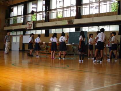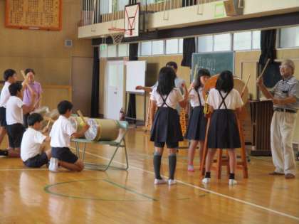 8月3日(土)、地域の盆踊り大会があります。その盆踊り大会で櫓の上で太鼓を打つ児童を高学年児童に募集したとこと、6年生の希望者が多く、本年度は6年の児童が行うことになりました。そこで、7月12日、地域の神代さんから太鼓の打ち方を教えていただきました。