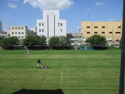 運動場では午前中、教頭先生と管理作業員さんが運動場の芝刈りをしていました。