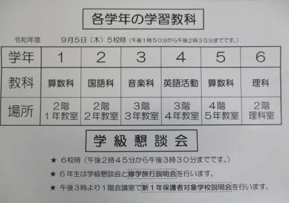 9月5日(木)は学習参観と学級懇談会、6年修学旅行説明会があります。 公開日 2019/09/04 更新日 2019/09/04 学校日記 各学年写真のような内容で学習を行います。また、学校選択制による新1年保護者説明会も行います。1階廊下には自由研究を掲示したり玄関ケース等には作品を展示したりしています。子どもたちのがんばりを見てください。 いいね(0)