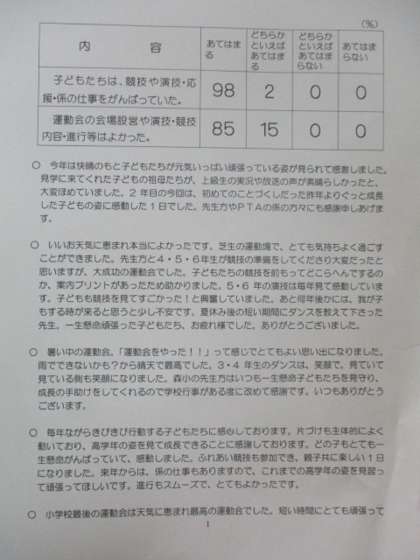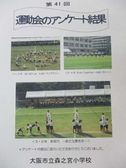お忙しい中、運動会のアンケートを提出いただきありがとうございました。本日出していただいたアンケートは明日配布します。