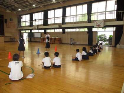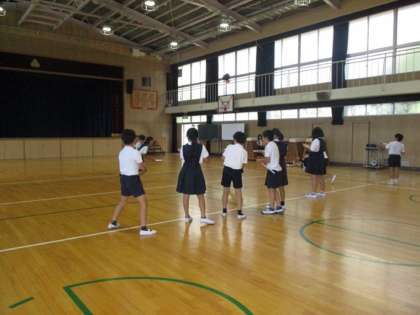 講堂で「とじこめられた空気と水」の学習のまとめとして空気でっぽう大会をしていました。押し縮められた空気がもとにもどろうとする力を利用して、たまを飛ばします。大会本番はリハーサルと違った子どもが1番になり会は盛り上がっていました。