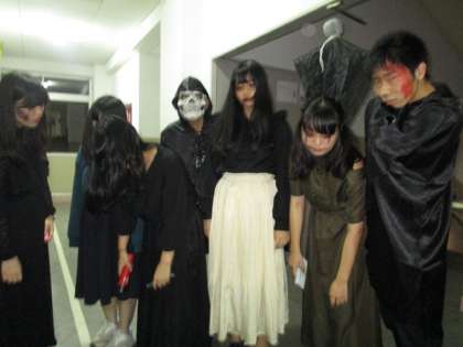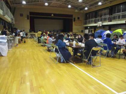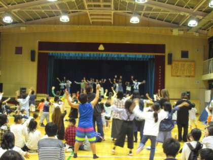 夕食のカレーは写真のようにみんなで食べています。3杯お代わりをした子どももいたようです。次は好評のスタンツの披露です。これは5・6年の林間学習の出し物を再度披露しています。最後に、6年生の呼びかけでみんなで舞台にあがり「パプリカ」を踊って楽しみました。最後の写真は、お化け役の生徒です。本校の卒業生とその友だちが「肝だめし」を盛り上げてくれました。夜中の見守りは地域の方もしてくれていました。地域・PTAのOBの方々、現PTA・保護者の皆様子どもたちのためにありがとうございました。