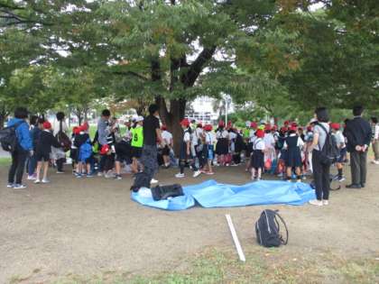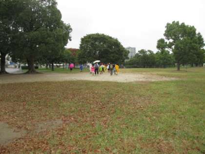 保護者の皆様には、ご心配をおかけしましたが、無事遠足が終わりました。雨のため午前11時30分頃鶴見緑地駅に向かいました。やや短めのオリエンテーリングでしたが、6年生はポイントのゲームの説明をしたり地図をみながら次のポイントに連れて行ったりして、リードしていました。また、5年生は班の低学年のレインコートをビニルの袋に入れ、持って回っていました。