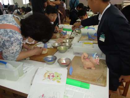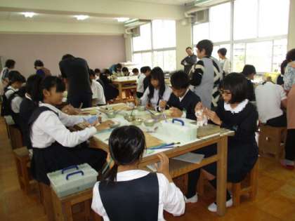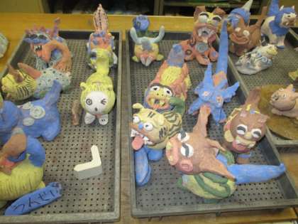 6月末5・6年生は、生涯学習の陶芸教室の皆さんにシーサーの作り方を教えてもらいました。10月21日(月)に素焼きをしたシーサーの色付けを教えてもらいました。陶芸用の絵具は水の加減で出来上がりがかわりますので、絵具をつくってもらい慎重に色塗りをしました。この後釉薬を塗り1200度の電気釜で本焼きをしてくれます。