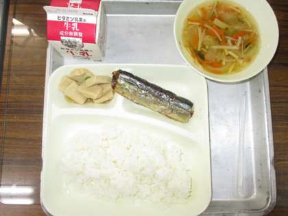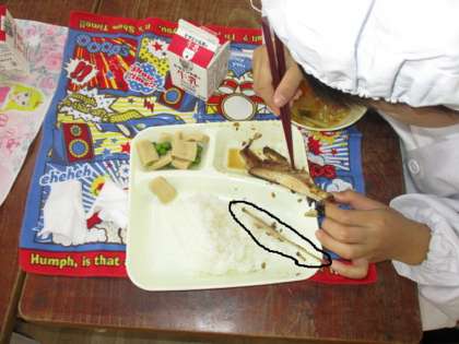 10月28日(月)の給食の献立は、さんまのさんしょう焼き、すまし汁、高野どうふの煮物、ごはん、牛乳でした。骨つきのさんまでしたのでどのように食べているのか1年生の教室を訪問しました。骨を上手に取った子どもが見せてくれましたので、紹介します。他の学年の子どもはどうだったかな。ご家庭でも聞いてみてください。