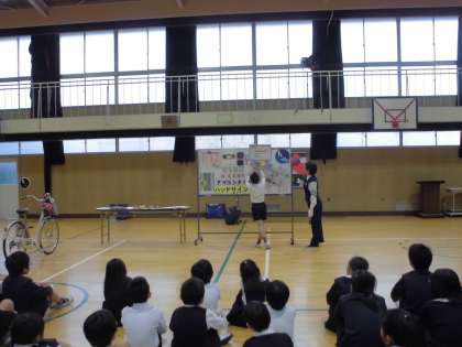 10月29日(火)城東署員の方を行使として、4・5・6年は「安全な自転車の乗り方」、1・2・3年は「正しい歩行の仕方」を学習しました。横断歩道を渡る時は、右・左・後ろを見ることや、青の信号が点滅している時は渡らないこと。正しい自転車の乗り方では、身体にあった自転車にに乗ることや、暗くなりはじめたらライトをつけることなどの説明を受けたり実際に行動したりしました。