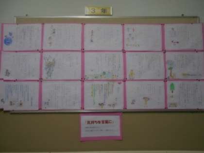 校内の掲示物の紹介 公開日 2020/01/20 更新日 2020/01/20 学校日記 2階には「2学期の本の貯金王」の子どもを紹介していました。1年の掲示板には「めでたいね えがおまんてん キラキラだ」など「はいく入門編」として、俳句を掲示していました。3階には3学期のめあてや3年の掲示板には、国語科の学習「気持ちをことばに」の学習後、自分の生活で感動したことを詩に表していました。 いいね(0)