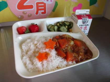 2月18日(木)の給食の献立 公開日 2021/02/18 更新日 2021/02/18 学校日記 本日の給食の献立はポークカレーライス きゅうりとコーンのサラダ いちごです。星の形をしたラッキーにんじんは流れ星を見立てているそうです。 いいね(0)