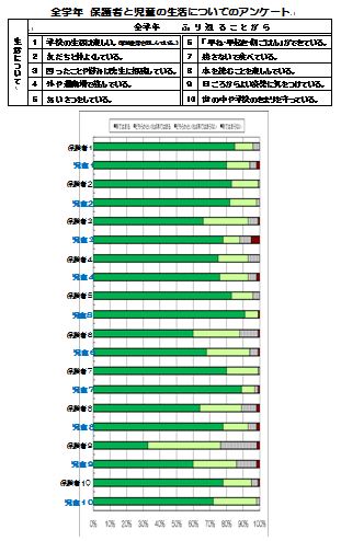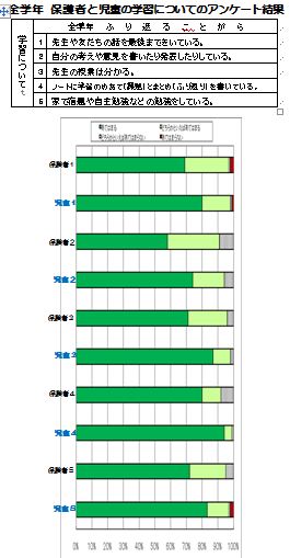 今回のアンケートの回収率は91%となっています。保護者の皆様ご協力ありがとうございました。学習についてのアンケート結果は、保護者の皆様と児童との違いが少なくご家庭で学習のことを話題にしていただいていることが分かります。肯定的評価は90%以上で良好となっています。生活については、保護者の皆様と児童との捉え方に違いがあり、今後も保護者の皆様と連携して取り組みたいと考えています。