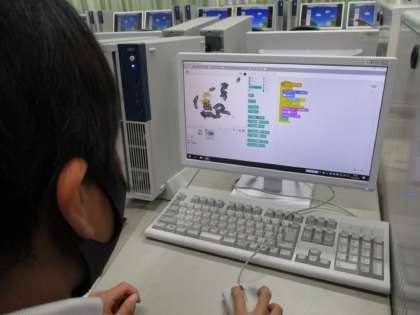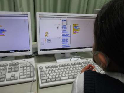 3月3日、4年生はプログラムの基本構造を知り活動できるようにするため「ねことねずみのプログラムをかこう」という内容で学習しました。ねずみがねこから逃げるために「前に進む」「角度を変える」「大きさを変える」などをプログラムしたり、さらに音を出したり違うキャラクターを登場させたりして工夫していました。