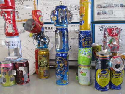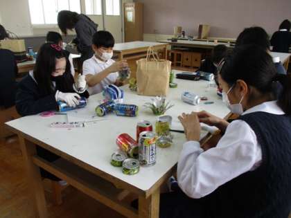 5年生ではアルミ缶の変身と題して「タワー」を作っていいました。ゴミとして捨てられるはずだったアルミ缶を紙と同様に、切ったり曲げたりして「タワー」によみがえらせていました。接着はホットメルドという接着剤を熱で溶かして接着させるホットボンドを使っていました。