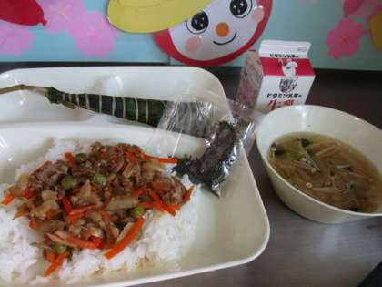 本日の給食献立は、きんぴらちらし 牛乳 すまし汁 ちまきです。ちまきは、コメの粉などで作ったもちを笹の葉につつみ、蒸して作る和菓子です。「こどもが元気に育ちますように」という願いを込めて食べます。
