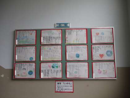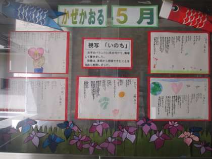 5月の玄関掲示 公開日 2021/05/10 更新日 2021/05/10 学校日記 5月になり玄関には6年生の視写「いのち」が掲示されています。背景の絵は詩の言葉から想像したことを自由に表現したそうです。森小では、掲示物を通して、子ども一人一人のよさや頑張りを知り、互いに認め合う場と捉えています。 本日の給食献立は、ごはん 牛乳 さけのごまみそ焼き 五目汁 ひじきのいため煮です。 いいね(0)
