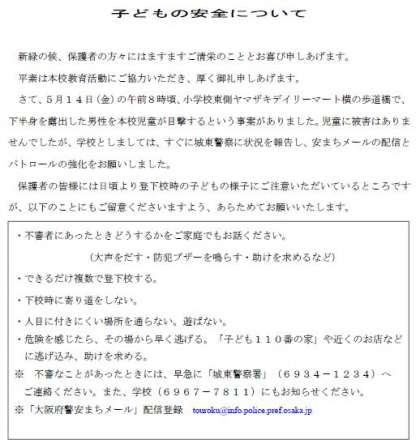 「子どもの安全について」本日手紙を配布します。よく読んでいただよろしくお願いいたします。