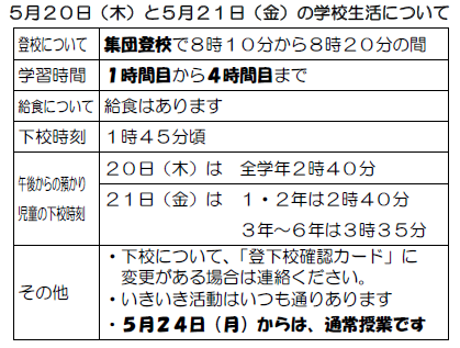 5月20日(木)・5月21日(金)と5月24(月)からの学校生活について 公開日 2021/05/18 更新日 2021/05/18 学校日記 本日、5月20日(木)・5月21日(金)と5月24(月)からの学校生活についての手紙を配布しました。よろしくお願いします。 いいね(0)