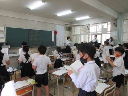 5月26日(水)2年生の国語科研究授業を行いました。 公開日 2021/05/28 更新日 2021/05/28 学校日記 教師の指導力を高めるために、研究授業を実施しています。本年度第1回目は、2年生の国語科「名前を見てちょうだい」でした。はっきりとした声での音読、シーンとした中での視写、次は課題についての読み取りです。自分の考えを書きみんなで交流し、考えを確かめたり深めたりしました。最後の音読もしっかりできていました。 いいね(0)