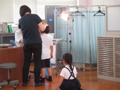 本日の給食献立は、黒糖パン 牛乳 和風焼きそば オクラの甘酢あえ オレンジです。1年生の歯科検診の様子です。