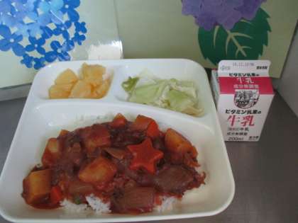 本日の給食献立は、ハヤシライス 牛乳 キャベツのゆずドレッシング パインアップル(カット缶)です。