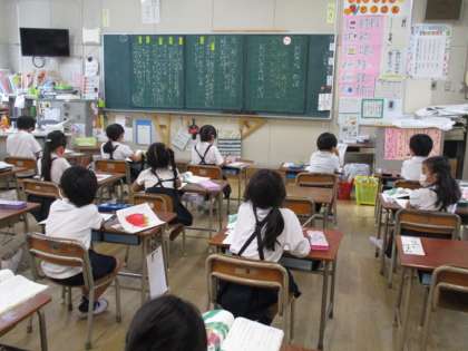 6年生は算数科「円の面積を求めよう」という課題でした。5年生も算数科で「あまりのあるわり算の仕方を考えよう」の学習でした。1年生は国語科「大きな かぶ」で、「大きなかぶがぬけなくて、おじいさんはなんといっただろう」という課題で学習していました。