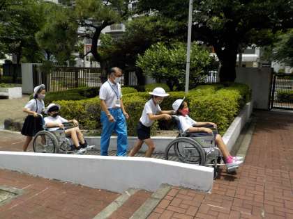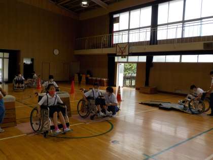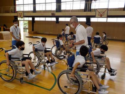 7月15日(木)、5年生は大阪市障がい者リハビリテーションの方から車いす体験をしていただきました。最初は、講堂で実際に車いすに乗り、操作の仕方や車いすを利用する人への介助の仕方を教えていただきました。次は、校内で車いす体験をしました。子どもたちは、車いすに乗ってみて初めて、普段の生活では気づかない段差の怖さや、車いすを押される側になった時の緊張感を味わったようです。