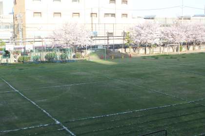 正門の桜の木は満開に咲き誇り、運動場では芝生の「緑」と桜の「ピンク」が並び、とても美しい景観になっています。