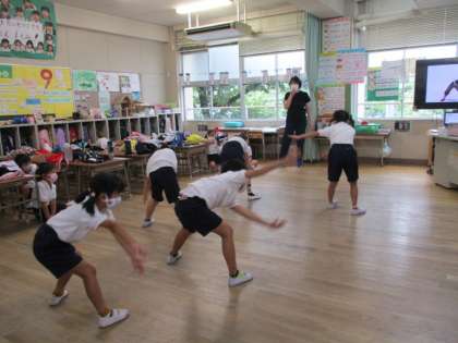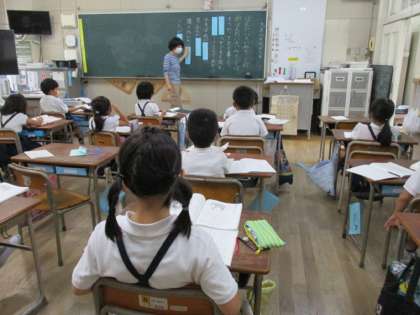1年生はラジオ体操の練習をしていました。2年生は国語の学習です。