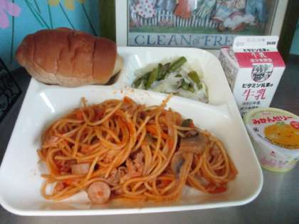 本日の献立は、黒糖パン 牛乳 イタリアンスパゲッティ グリーンアスパラガスとキャベツのサラダ みかんゼリーです。