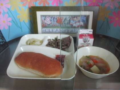 本日の給食の献立は、コッペパン いちごジャム 牛乳 牛肉の香味焼き スープ煮 サワ−キャベツです。