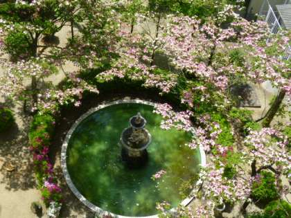 本校の中庭にハナミズキの花が咲き誇っています。とてもきれいです。 2階からの写真をどうぞ。
