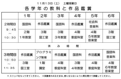 11月13日(土)の土曜授業日の受付時間は、午前9時30分より行います。下校時刻は午前11時45分頃です。