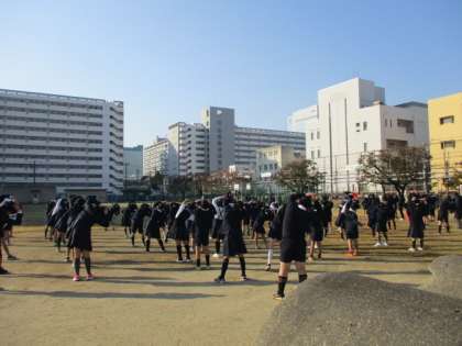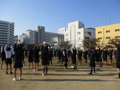 全校朝会で姿勢体操をしました。