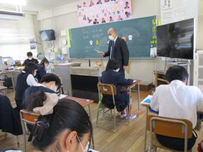 例年城陽中学校区の関連4校の小学校に城陽中学校から出前授業に来ていただいています。これは、大阪市振興計画に基づくもので、小中連携活動の一環として行っています。
