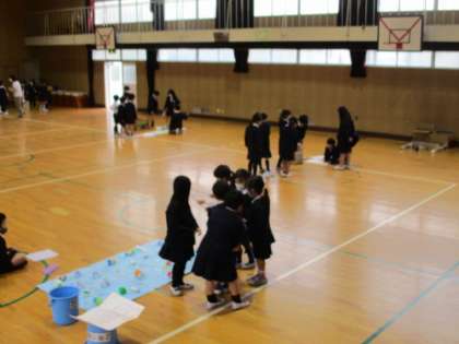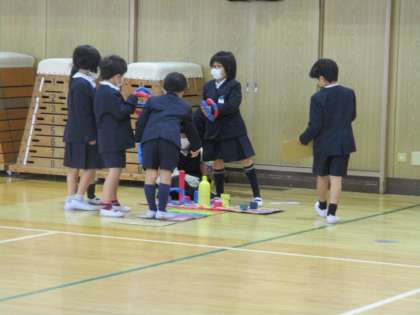 2年生は生活科のおもちゃ名人で「トコトコぐるま」や「パッチン」「ワイワイさかなつり」「わなげ」「たまいれ」「ボーリング」のお店を作りました。国語科の「あそびかたをせつめいしよう」の学習と関連させ、1年生に遊び方やルールを説明していました。
