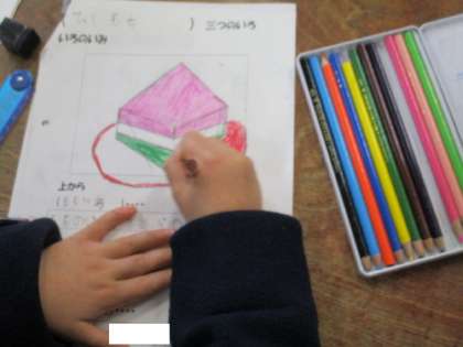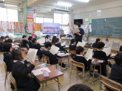 「あかりをつけましょ ぼんぼりに お花をあげましょ・・」という歌が1年生の教室から聞こえてきました。子どもたちは、ひしもちや桃の花、ぼんぼりなど「ひなまつり」に関係のあるものをみんなで出し合っていました。