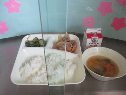 本日の給食献立は、韓国・朝鮮料理ナムルです。ごはん 牛乳 豚肉のコチジャンいため 鶏肉とはるさめのスープ きゅうりのナムルです。6年生は森小で最後の給食になります。味わって食べてください。