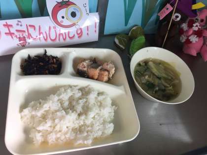 今日の給食は、ごはん、牛乳、さけのごまみそ焼き、五目汁、ひじきのいため煮です。ひじきは、わかめやこんぶと同じ海そうのなかまです。給食では「いため煮」のほか、サラダのドレッシングに加えたり、手作りふりかけの「牛ひじきそぼろ」や「ごまひじき」に使ったりしています。